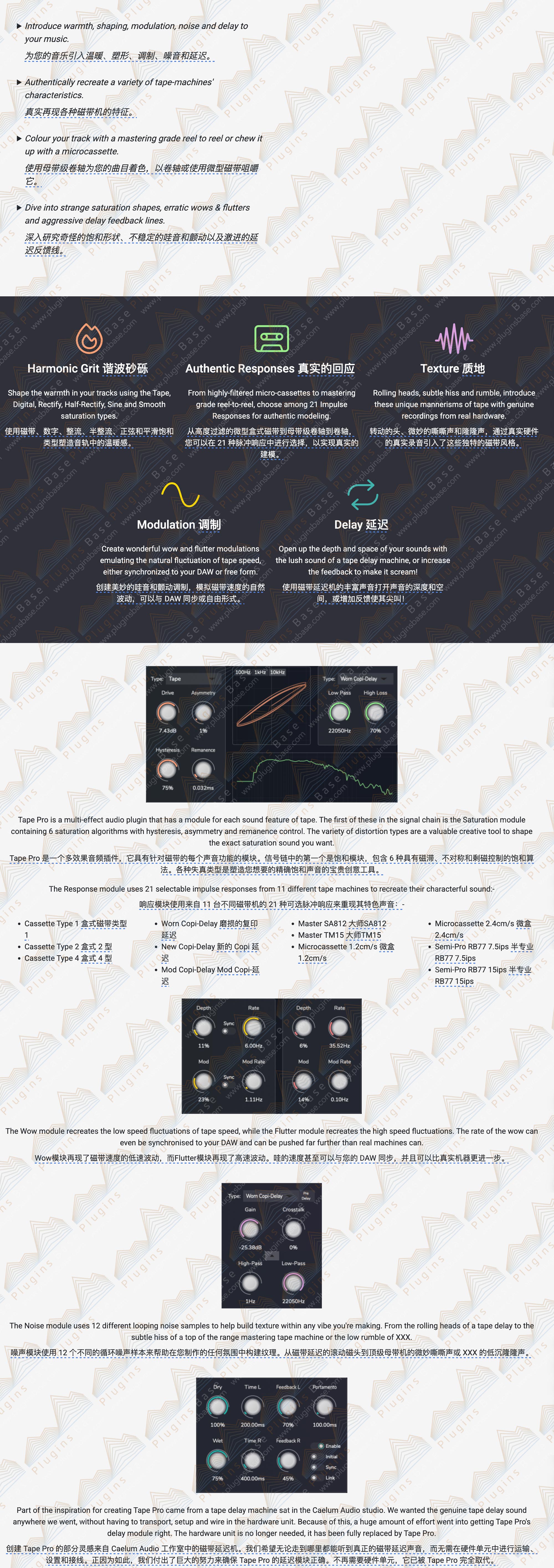 创建Tape Pro的部分灵感来自Caelum Audio工作室的一台磁带延时机。我们想在任何地方都能听到真正的磁带延迟声音,而无需在硬件单元中进行运输、设置和布线。正因为如此,我们花费了大量的精力来修复Tape Pro的延迟模块。不再需要硬件单元,它已被Tape Pro完全取代。