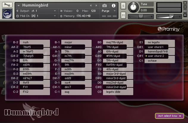 The extensive number of the ‘real’ chord samples makes your guitar tracks very convincing. (octave, major, minor, 7th, m7, maj7, add9, sus4, 9th, m7(9), maj7(9), dim7, aug, open / low chords, etc.) Hummingbird includes the huge number of ‘real’ recorded (in other words, ‘pre-recorded’ or ‘pre-played’) chord samples. You can instantly access the various types of guitar chords. Prominy’s guitar libraries are the only ones that include such a huge number of the real chord samples.
