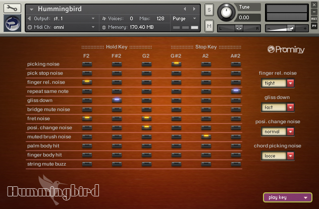 Hummingbird includes a larger number of percussion samples (hitting, tapping, knocking the various part of the guitar’s body) that enable you to play and create percussive and rhythmic guitar tracks.