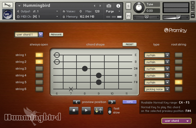 大量的“真实”和弦采样使你的吉他曲目极具说服力。(八度、大调、小调、七和弦、小七和弦、大七和弦、加九和弦、挂四和弦、九和弦、小七挂九、大七挂九、减七和弦、增和弦、开放/低音和弦等)Hummingbird包含大量“真实”录制(或“预录制”、“预演奏”)的和弦样本。你可以即时访问多种吉他和弦。Prominy的吉他库是唯一包含如此庞大数量的真实和弦样本的库。