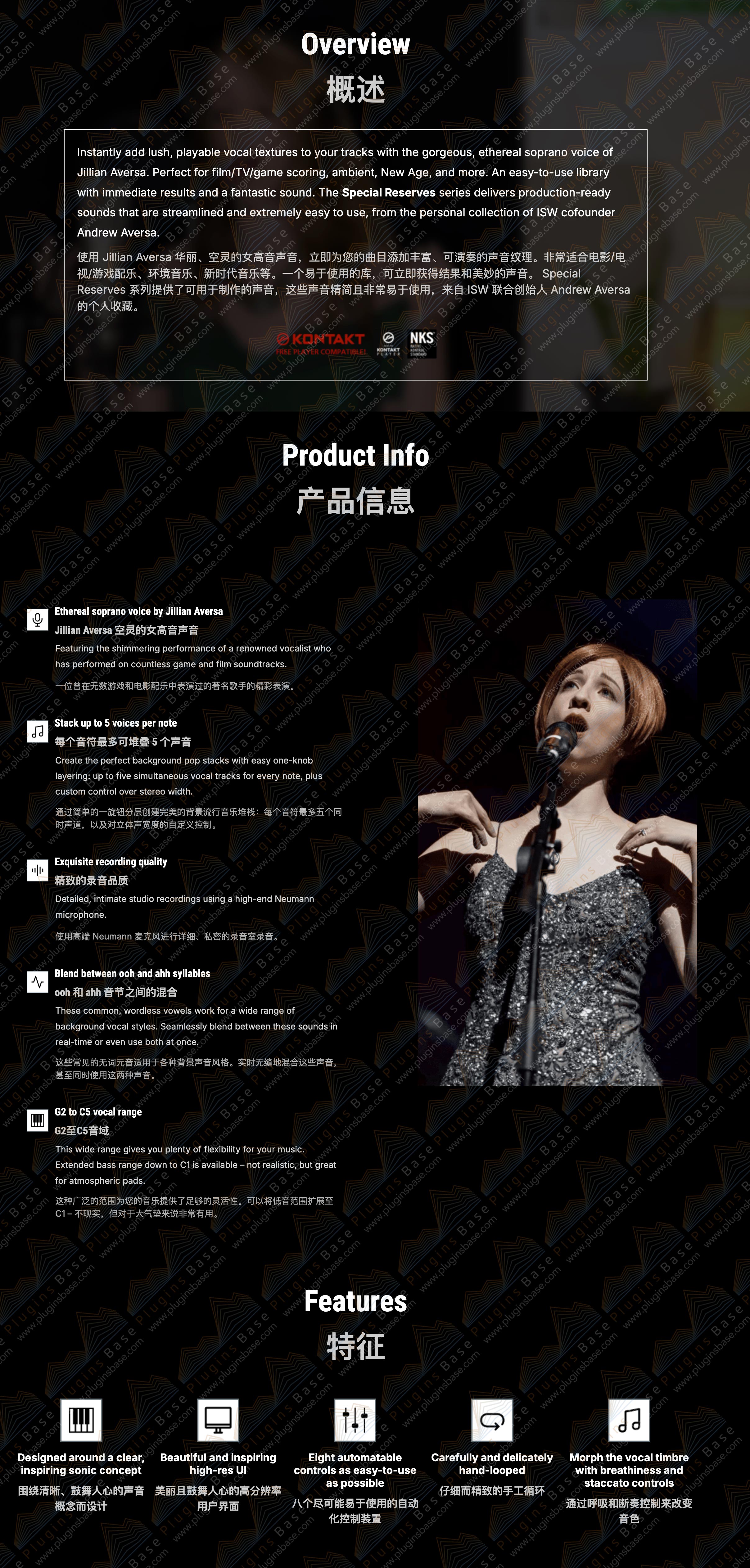 立即为您的曲目添加丰富、可演奏的声乐质感,使用Jillian Aversa迷人而空灵的女高音。非常适合电影/电视/游戏配乐、氛围音乐、新世纪音乐等。一个易于使用的音色库,能够带来即时效果和出色的音质。Special Reserves系列提供可直接用于制作的音色,简洁且极易使用,取自ISW联合创始人Andrew Aversa的个人收藏。