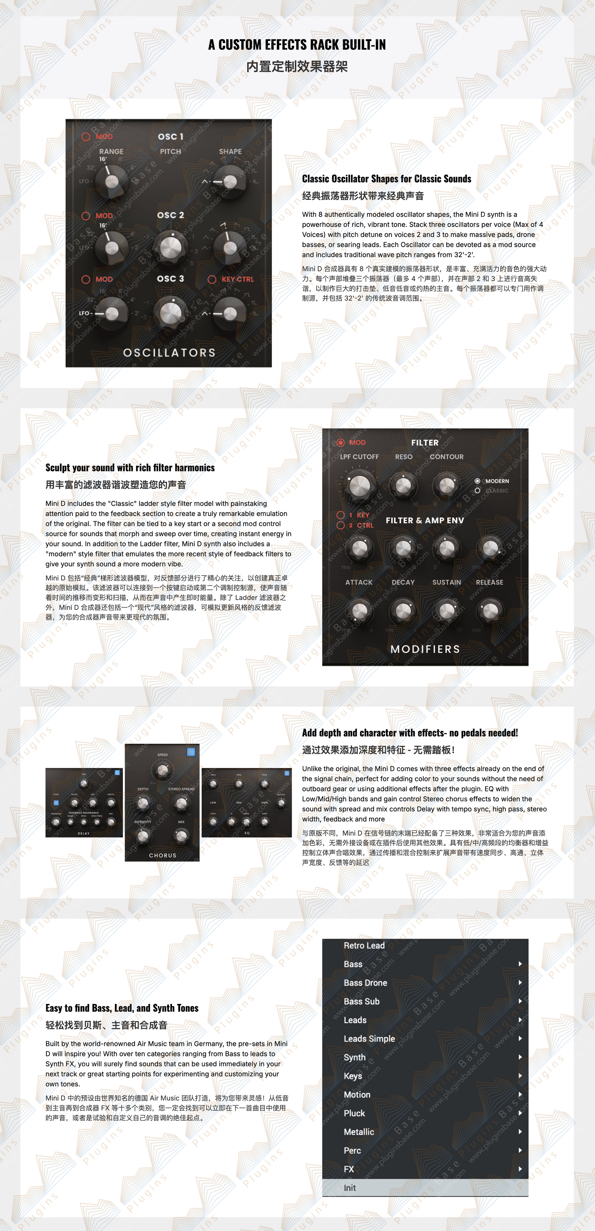 由德国AIR音乐技术团队打造的预设库涵盖十大分类——从低音声部、主奏音色到合成特效,既可立即投入作品创作,亦可作为个性化音色定制的灵感起点。