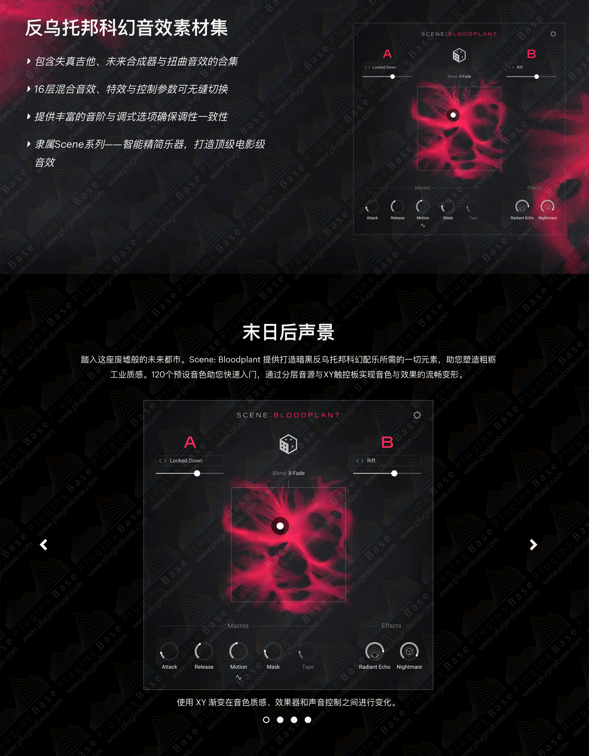 踏入一片废墟中的未来都市。Scene: Bloodplant 拥有打造粗犷工业质感所需的一切元素,专为暗黑反乌托邦科幻配乐而生。借助 120 种预设快速入门,叠加音源,并通过 XY 触控板在音色与效果间自由变换。